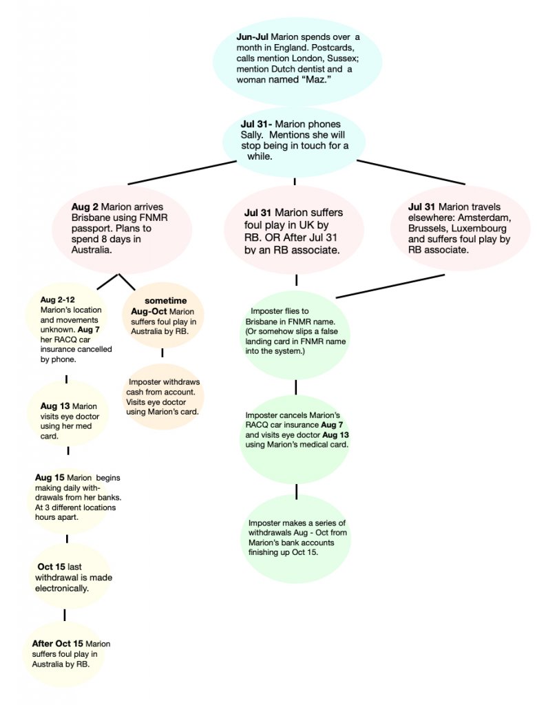 One thing the chart makes clear to me, and in my opinion only, is that the gap between Marion's supposed arrival in Brisbane and the first withdrawal is a major clue. Either Marion was sick and couldn't get to the bank as soon as she wanted to; or Marion did not return to Australia in order to withdraw money and had to be persuaded to while there; or RB had to scramble to come up with an accomplice and a plan once Marion was dead (either accidentally or on purpose) and it took him a while. View attachment 433216