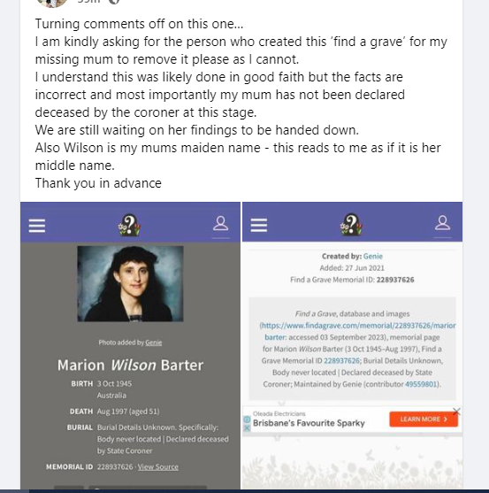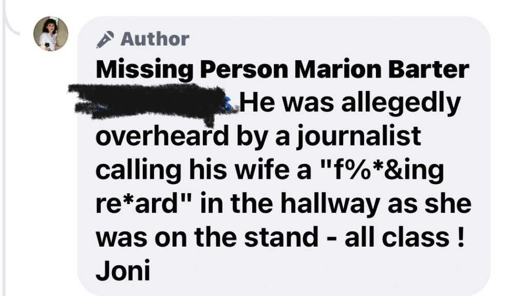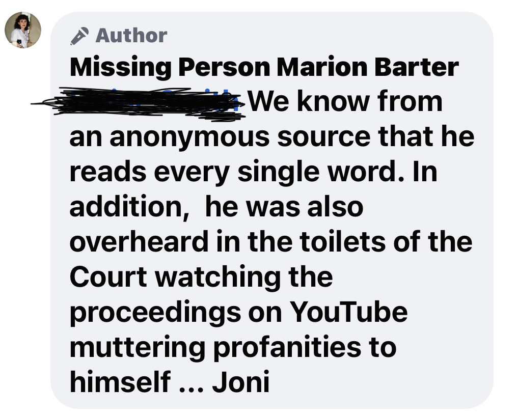 Some interesting comments fromJoni in the comments section on the MPMB FB post headed SILENCE, re the last cash withdrawal on Marion’s account. His true character just can’t help itself shining through.