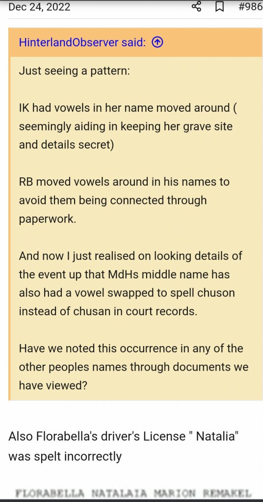 That’s correct, the FNMR QLD drivers licence had the gender as male as well as the extra ‘a’ in Natalia as you have noted. Both ‘typos’ would lessen the likelihood that anybody would be able to match the record should they ever try to search, just like the extra space in Remakel in the lonely hearts ad in 1994.I have a vague memory, from an old post, that Marion''s new drivers licence in FNMR had 'male' on it? Or I'm mistaken?