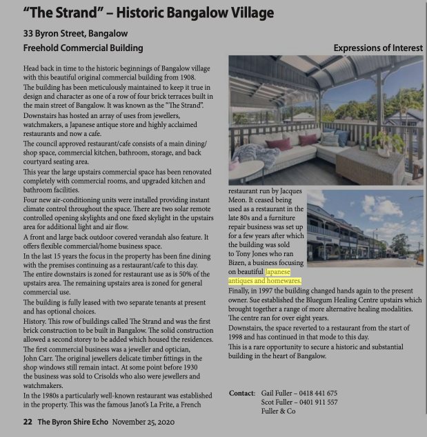 This is the link to The Byron Shire Echo (25 November 2020). The article is on page 22 that mentions a Japanese antiques and homewares business.