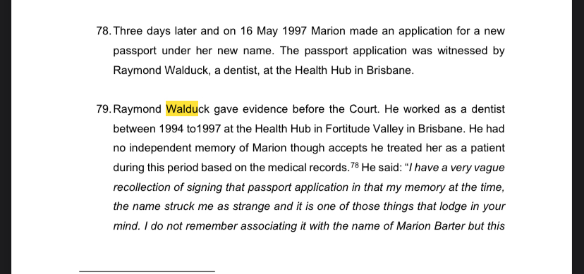 Point 76 of Coroner’s Findings - IIRC, MB's application for Change of Name, was presented and shown on the AV screen during the hearings. It was witnessed and signed by two females (possibly teacher colleagues) which IMO, differs from there being no evidence that anyone was aware of this. Any recollections??