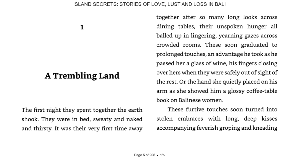 Next morning she gets up to find someone, a man, has left her a gift of a basket of mangoes. She goes down to the beach and sees the same young guy again. It's him who left the mangoes. They have breakfast together and he, Wayan, tells her a bit about himself, she tells him her name. Then he has to leave and she passes her day and returns to her villa. Wayan comes round in the evening and flirts with her, they kiss but he doesn't want to take it further for now and leaves.