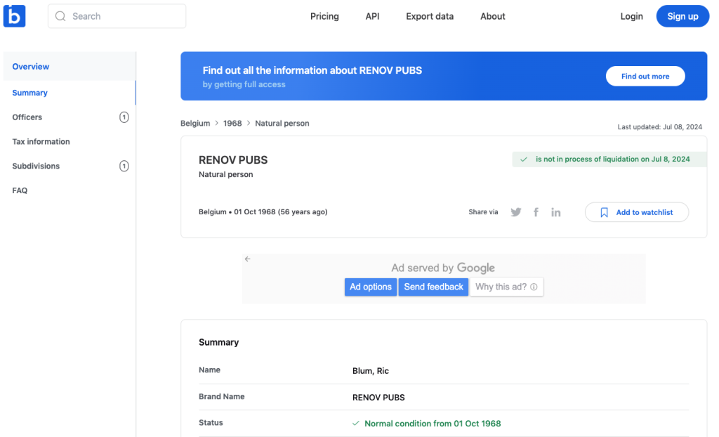 “Back on the stand, he’s questioned about a business named Renov Pubs registered in Belgium. The company was registered in 1968 by Frederick De Dehervary. Since 25 May 2021, the business number has been linked to Ric Blum and is still active.