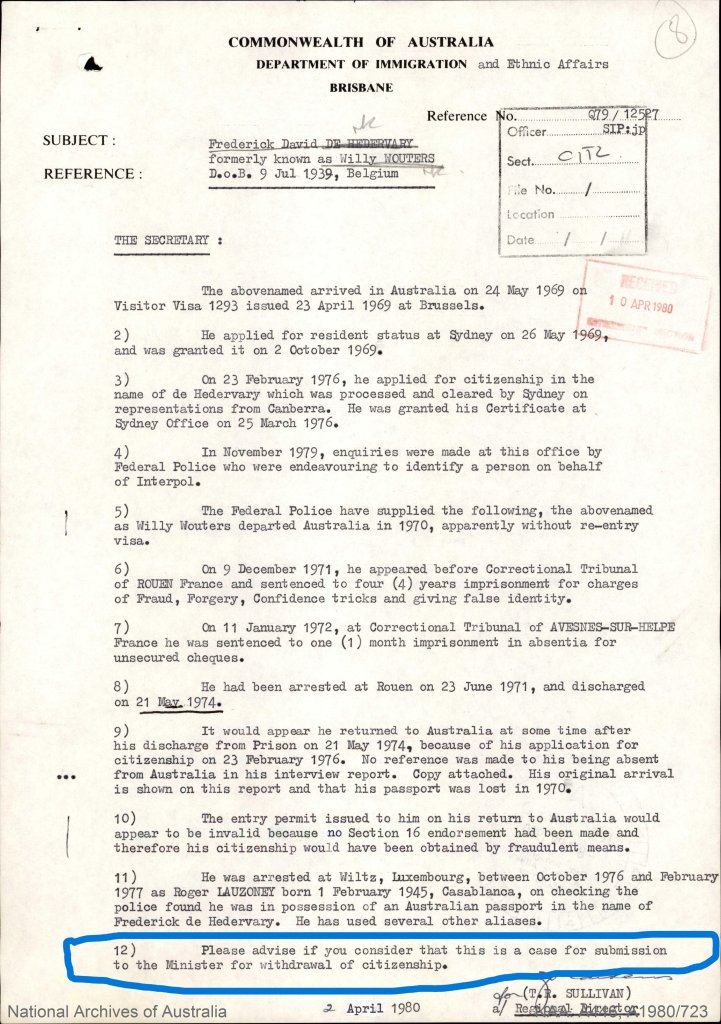 Willy Wouters - BELGIUM issued passport NUMBER ONE - AH real birthdate = he has ONLY used this name once coming into Australia AND changed his name back to this in 1989