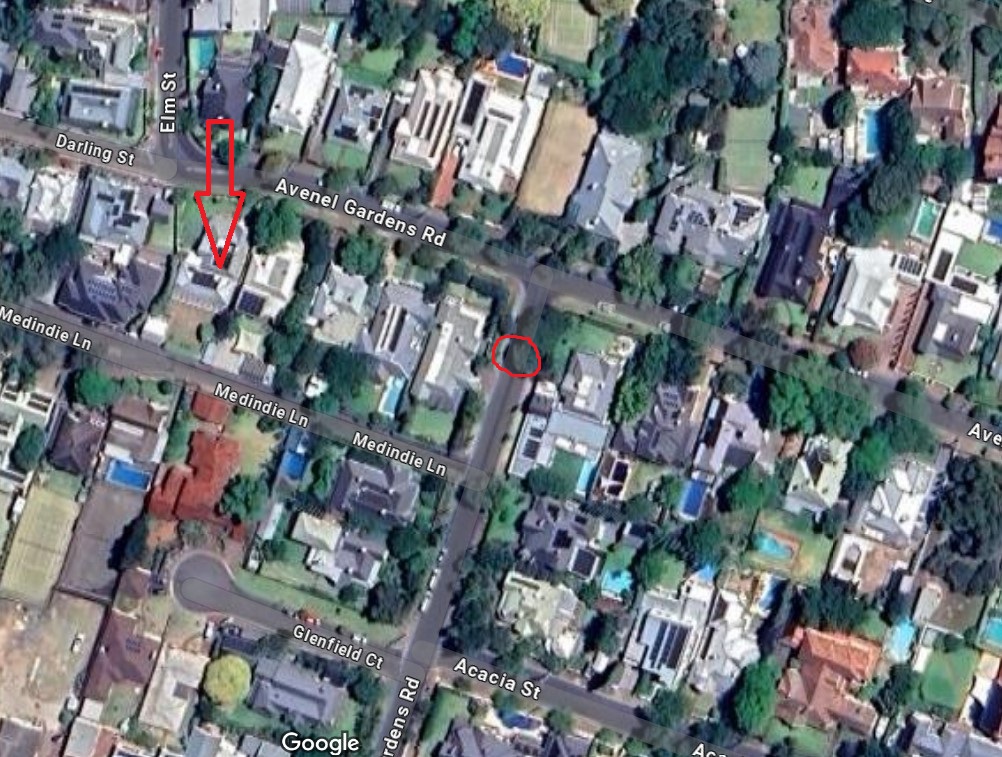 I have circled in this pic where the markings are (pretty close if not exactly there). Also arrowed their house again - roller door at the back in the alley.