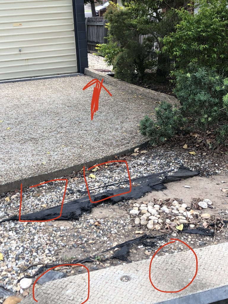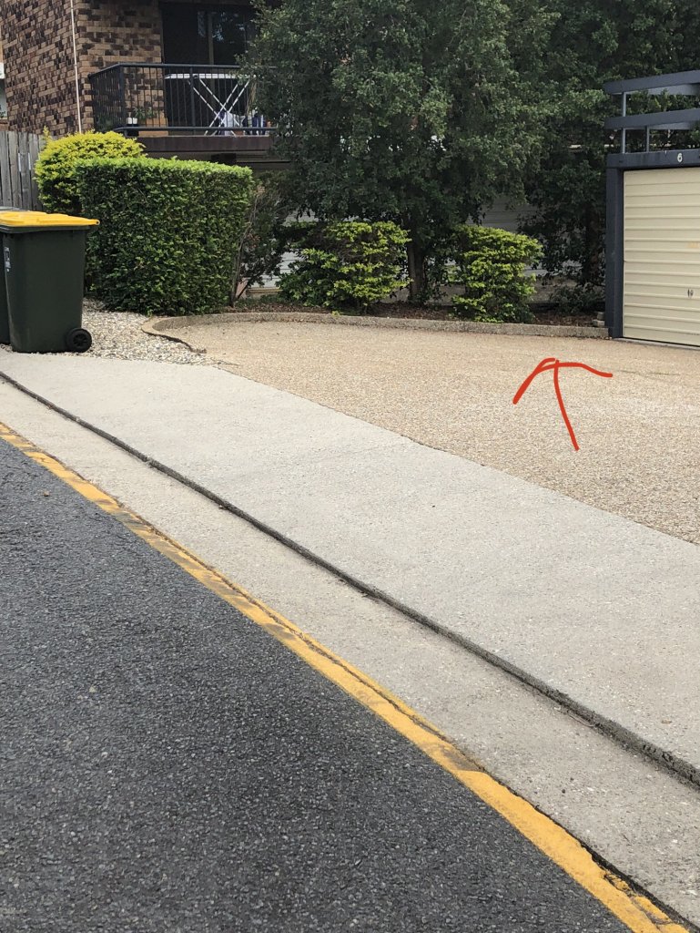 The two squares are where the complex's recycle bins (yellow lid) would stand during the fortnight between collections. The two circles are where LT would move the bins to stand for collection. I last saw her on Monday 27 March at 10-11am moving them here to the front position (as I already told police). You can see the patch of earth where the bins have been habitually pushed. As I viewed this from a bit of a distance, I can't recall if the whitish areas or the darkish areas of concrete is the position where the bins rested before collection early Tue morning.