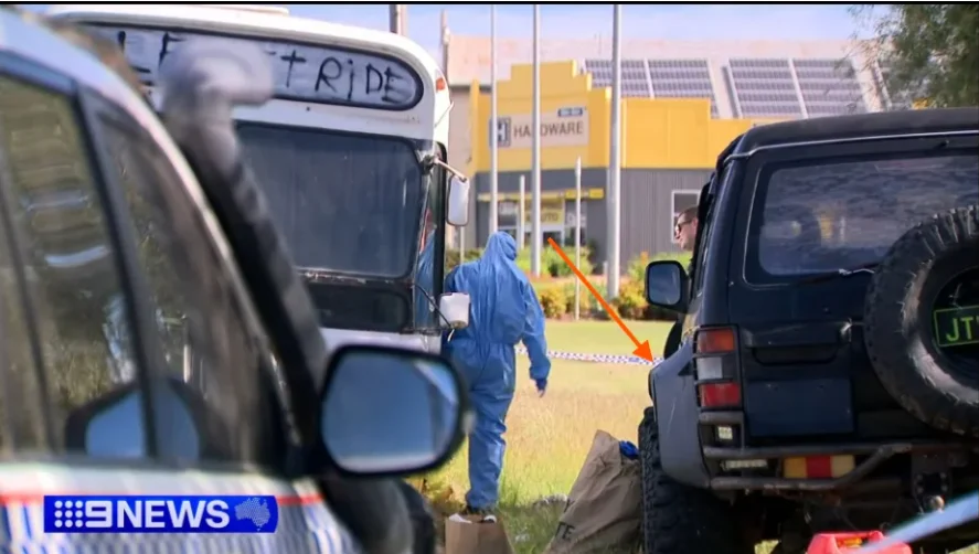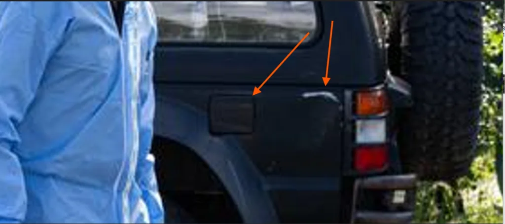 Well he wouldn't have needed to drive it to any servo to fill it up because he seems to be a collector of Jerry cans.!QPS most likely removed the tape to see what was hidden underneath it. It looks like the car has hit something at the rear on that side. He taped a larger fibreglass fender flare over the small black rubber one. Maybe they also removed the fender flare for testing or evidence.