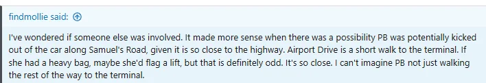 Even if she got out of the car on Airport Drive, no one saw her, no CCTV footage from the Airport.