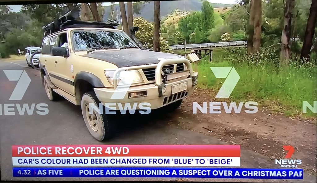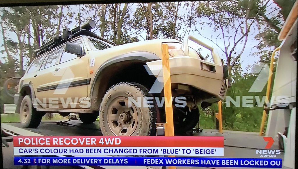 Great to hear there’s been an arrest. News are saying the 4wd is no longer blue, but been painted a beige colour. I’ll rewind and see if I can get a picutre