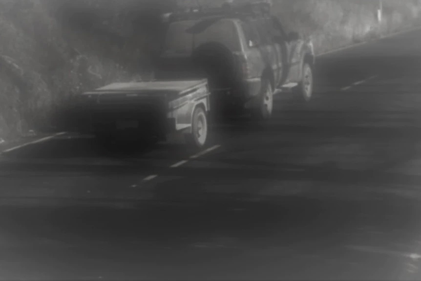 [Note also in the photo below that the trailer appears to have a licence plate. I understand that in Victoria a trailer takes to plate of the vehicle towing it. There is no indication when the photo came into the possession of the police or when they realised its significance. But in April this year they were still speaking of a "mystery white" ute, however, they spoke to Mr Lynn last year.]