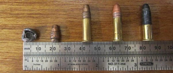 Left to right: a Winchester 36 grain hollow point recovered from a coyote, an unfired bullet of the same type, the complete cartridge, a 40 grain round nose CCI Mini Mag, a 60 grain Aguila Sniper Subsonic.