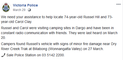 "Search and rescue officers believe the couple are not in the zone they have already searched and want to talk to people who were in the Wonnangatta area when the pair disappeared. "