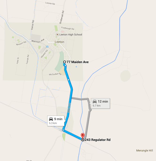 https://www.google.com.au/maps/dir/77+Maiden+Ave,+Leeton+NSW+2705/243+Regulator+Rd,+Yanco+NSW+2703/@-34.58779,146.4165295,14z/data=!4m13!4m12!1m5!1m1!1s0x6b1f1240b5307ce7:0x2e4b3a696b038cb7!2m2!1d146.410363!2d-34.563562!1m5!1m1!1s0x6b1f12dea9854f6f:0x102ee8db06d6140d!2m2!1d146.4236357!2d-34.610639?hl=en