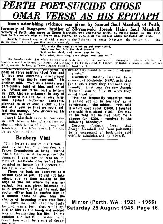 George Marshall was found dead in a Sydney park in 1945. There was a copy of the Rubaiyat close to where he was found. He was of the Jewish faith, as was Jestyn. The coroner's findings were that George had committed suicide. Was he at some stage a patient at Royal North Shore Hospital where Jestyn met him and kindly gave him a copy of the Rubaiyat?