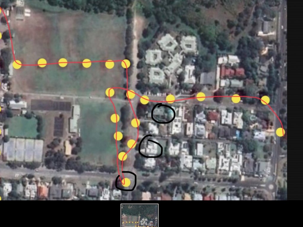 Theo lead across Rec Grounds to Cowper, then makes a dash to escape but is captured at intersection of Cowper/Carlyle, and taken back onto Rec Grounds, then onto Milne track per attached route.