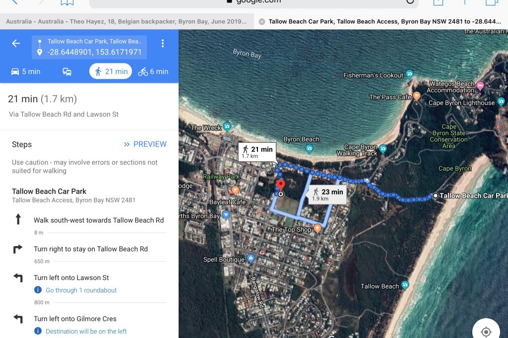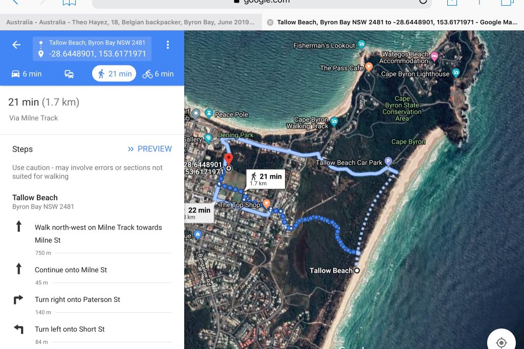 Google maps walking pace is calculated around 4.5km/h IIRC. That’s the speed Theo/his phone went up the hill past massinger, he walked from Tennyson to massinger at 6km/h and walked the sandy trail at 7.5km/h. If he travelled at those speeds going the Lawson/tallows beach Rd route he most likely would have made it there in less than 21 mins IMO.