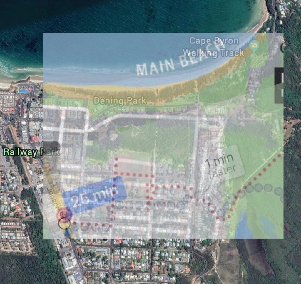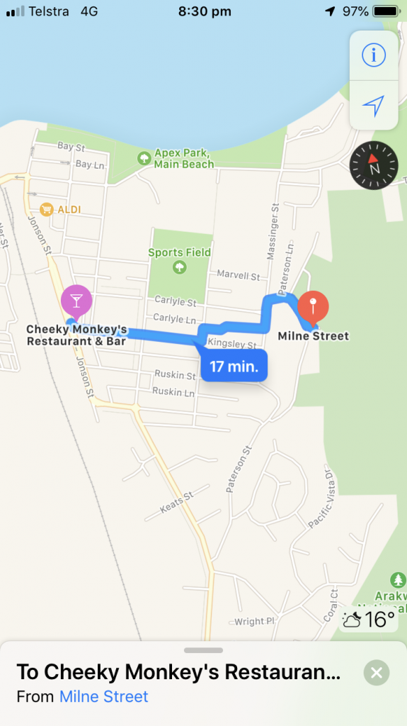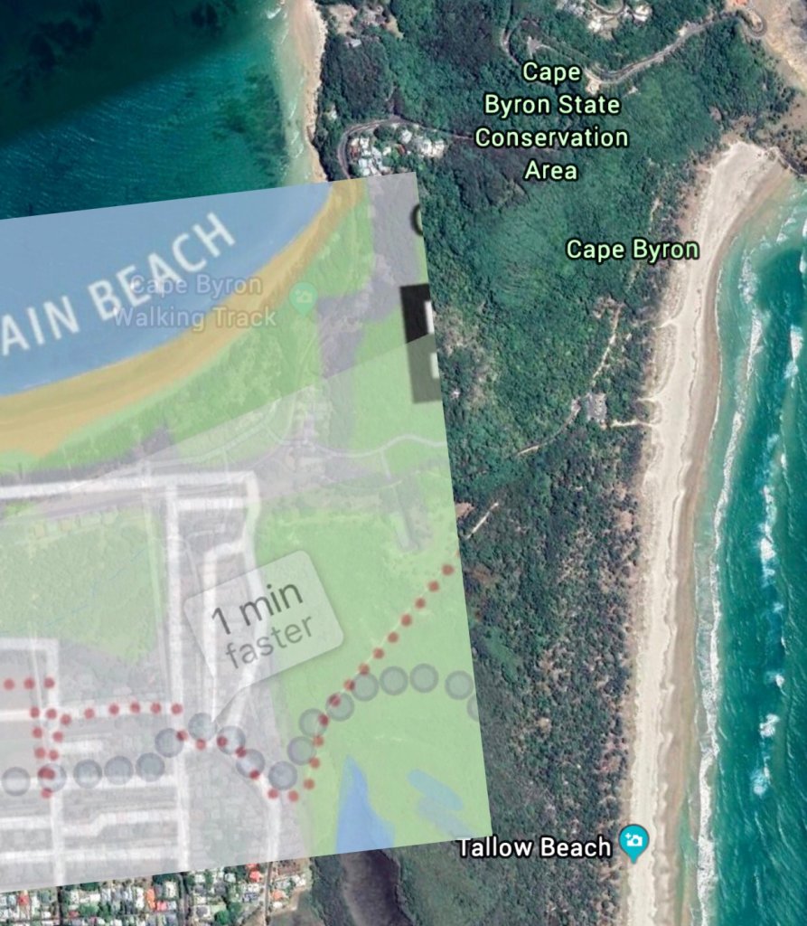 If you put Cheeky Monkeys to Tallow Beach into GMs, the shorter route is the one Theo took.