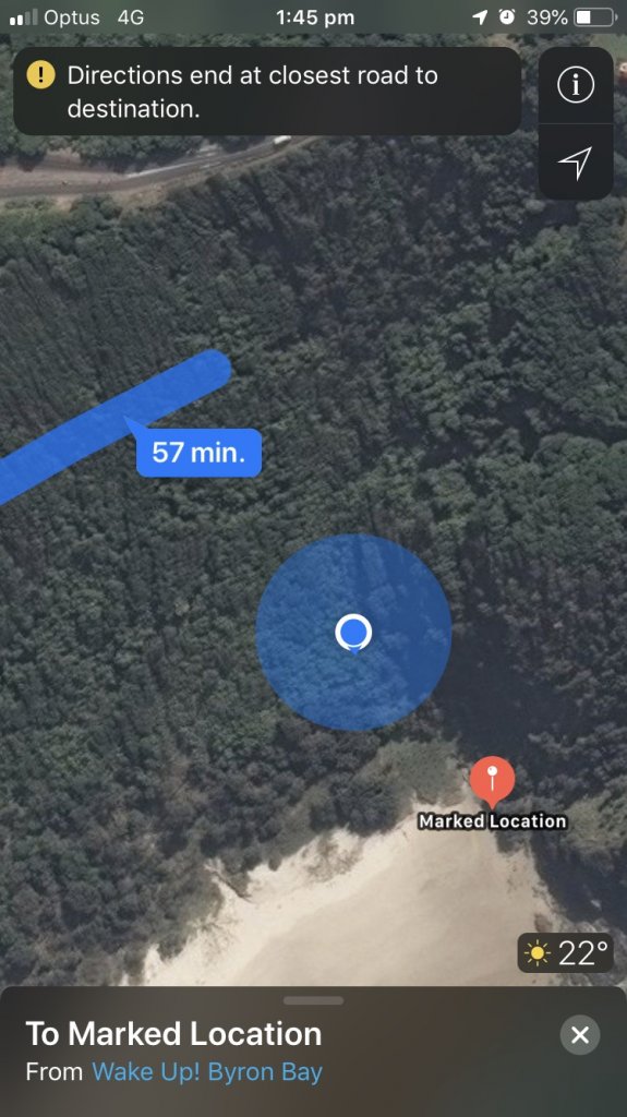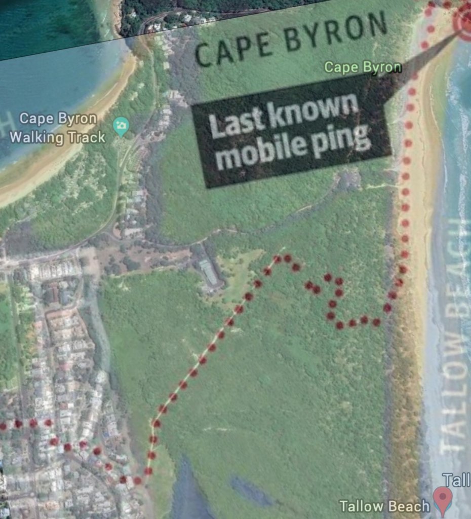I’ve been interested since the gps data showed he didn’t actually follow the Milne track, he went further north up what I now know is a fire trail, it doesn’t have a name but leads right behind the Arakwal depot, you can see it in the map, it’s actually the most prominent of the trails on google maps on satellite (cos this is a fire trail, a vehicle can go down, but a vehicle could not go down the Milne beach trail).