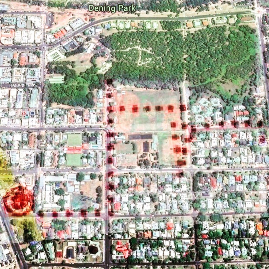 Where he actually walks up and down is at the oval along Cowper Street (not so much the next block down). He could be waiting for someone who was supposed to meet him at the Tennyson Street side of the oval, but then told him to walk across the oval to the Cowper Street side. He zigzags here, but once he leaves, it’s a direct or straight path. I see it as a curious blip on his journey.