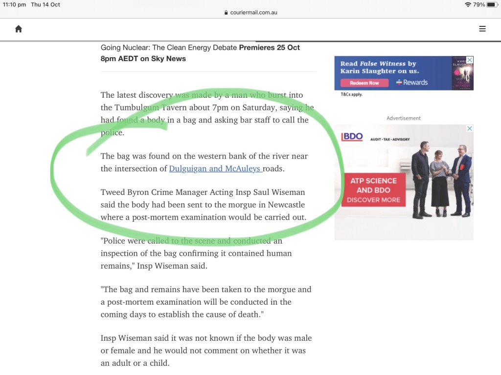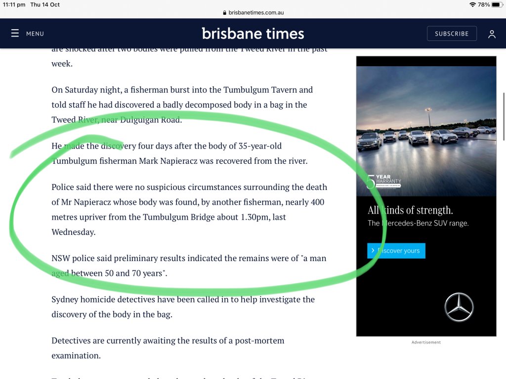 (Not being overly familiar with the circumstances of Gaby’s case, my guess that the reason it was possible to identify that she had been strangled was that her remains were preserved by being exposed to the arid, desert conditions in which she was found, whereas our Tumbulgum Man was found in a more humid, tropical environment making an autopsy more problematic).