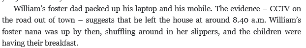 Mobile phone records have shown that William’s foster father left his mother-in-law’s home in Kendall at 9.30am on Friday, September 12, 2014.