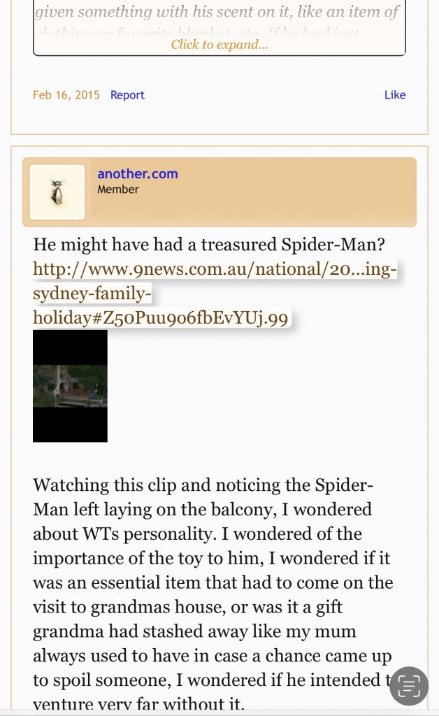 Wondering if anyone can recall this photo which was posted way back in one of the earliest threads. It has the Chanel 9 logo on it and I’m not sure whether or not there was an article attached to it. Looking at all the details like FGM blue slippers W sister little pink pram the water bottle on the table in between the 2 chairs.. it seems as though that picture was taken the same day WT went missing.. interestingly though you can see the Spider-Man toy laying on the back deck not far from the pram and in the 60min interview this is the exact same toy the FP show as being one of WT favourite toys. The only thing I wondered about was where was that toy when the pictures of W taken on the back deck that morning. The positioning of all the items in the picture seem to me like everyone had just dropped what they were doing in that moment