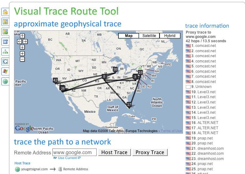 Heres a poor example of a visual trace to someone's IP. Packets are like envelopes that go to post offices. I found many hops even to my own machine, leave the country and come back.