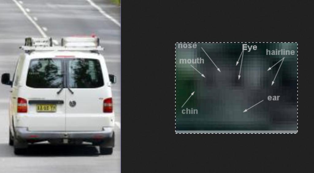 This is an image of the rear of the vehicle that went past police. Its more than likely a shadow but does appear to be a face. The journalist that has the original image would be able to provide a much higher definition blow up. Much easier to analyse. Much less pixelation. Images to the net quite often are 1/10th the definition the original.