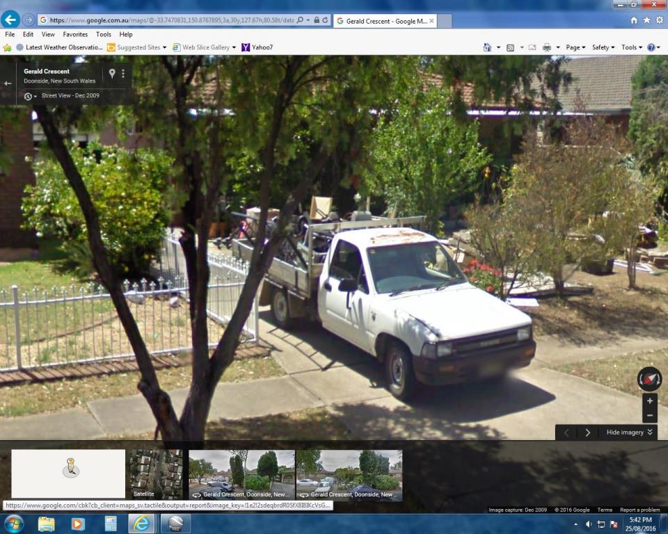 Google Maps Street View Historical Imagery of KL's house in Dec 2009 (two years later). Note possibly same white Toyota Ute in driveway - has letters TOYOTA across the grill. Don't think this is the same Ute as in the Feb 2014 Google Earth Street View image (just has Toyota badge on grill). All carrying bits of metal?.