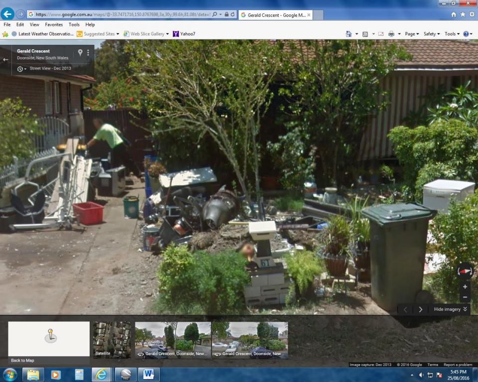 SIX Maps aerial image of KL's house and yard 16 January 2014. Lots of stuff (metal?) in front and back yard