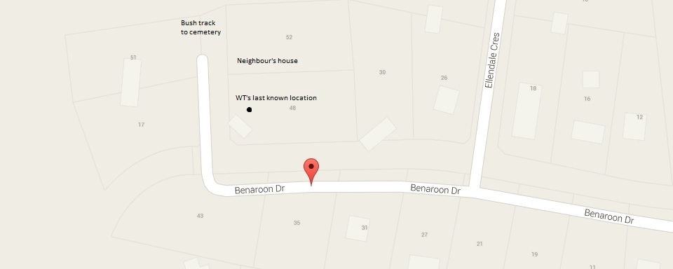 A screencap of the track from Benaroon Drive to the cemetery. Looking at some of the secondary roads on the map, it would have been quite easy to bypass the tennis courts in Graham Street where the CCTV was set up. I have the distinct feeling whoever took William knew the Kendall area well.