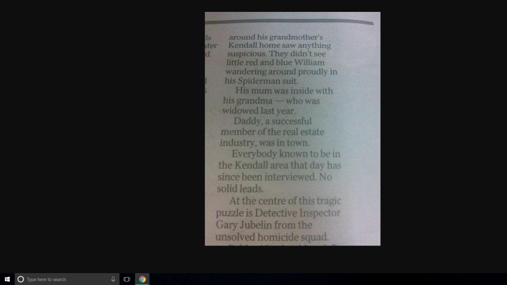 This is going to sound horrible but here goes. Spedding was driving to grandmothers place with part. He saw WT out front and abducted him. Rang his pedo mates Bickford and TJ. They did what they did to WT. Then one of them was given the job of getting rid of body. Which was most likely TJ. Thats why he came home late and drunk and Spedding and Bickford could organise alibis.Scroll and roll, Josh. That is what we are advised to do. The forum is about William and things relevant to him. Things that we can talk about, that have been mentioned in MSM. And the conversation rolls on from there.