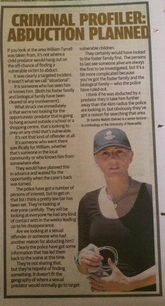 Xanthe Mallett, a UoN criminologist seems to be of the opinion that William’s was a planned, situational abduction, ie; the perpetrator lay in wait for an opportunity to take him when his carers’ backs were turned. Someone who went there specifically for William, who knew him from the local community or from somewhere else.