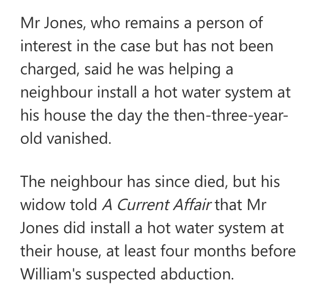 I think the key here is AJ’s alibi is that he was helping the deceased neighbour install a hot water system at their home on the day William disappeared but the neighbour’s widow disputes this, by stating AJ had installed it at least 4 months before that day.