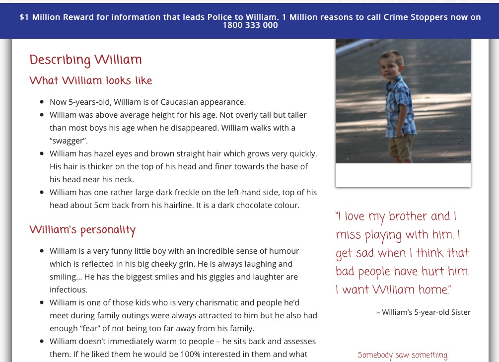 Heartbreaking. I really hope she has access to access to counselling as what has happened could really affect her growing up. This horrendous tragedy doesn’t have to ruin her chance to live of a happy life. Daniel Morcombe’s twin brother and siblings have managed to have productive lives despite Daniel being taken from them and I hope William’s siblings manage to as well.