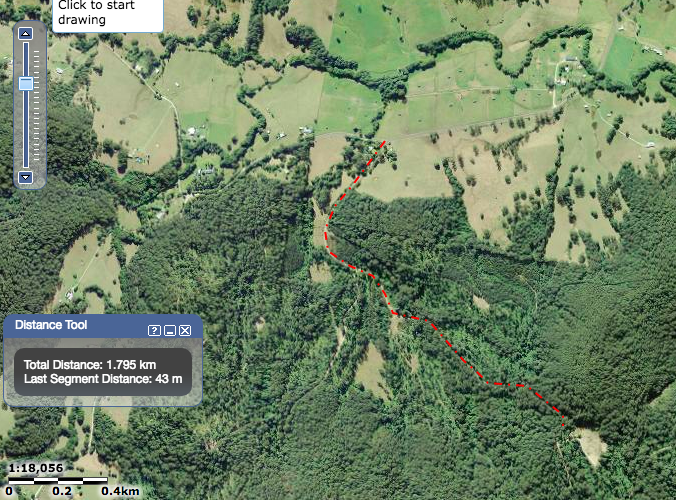 Here's a screen shot of stoney creek rd (in red until it reaches the large clearing). There's 2 cleared areas (one to left of the road - i.e. right of the screen) which SA showed yesterday (where it looked like several cars were lined up), and the larger one is at the end of the red line (old council gravel pit) although stoney creek rd passes by further. I'm not sure what the clearing is on left of the screen? These could be where they were looking, given the time frame of 12 mins?