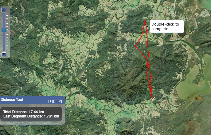 That's down toward the highway, a longer way, but possible to reach through bush tracks from stoney creek rd... thumbnail shows a straight line as the crow flies, they other shows the kind of route (very loosely) that a car would need to make, so half the distance & add a little - around 8-9km??