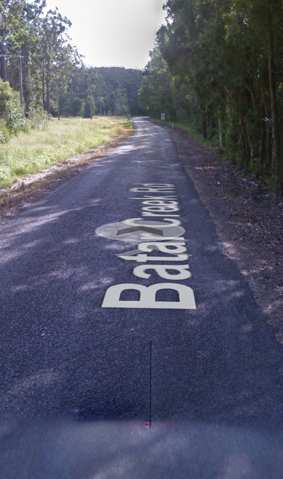 And to run it into the ground a bit further . . . south of the house line on Benaroon there is of course a sort of creek way. Clicking on the circled point where the creek way emerges to Batar Creek Road, this is the view. You can see where the water runs in relation to the fence line at the back of the line of houses. Google Maps