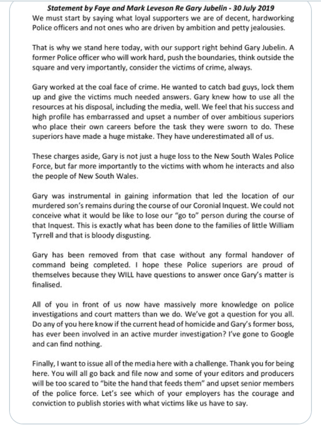Full transcript the statement I read out in front of court today, on behalf of @fleveson & myself, in support of Gary Jubelin who is facing 4 charges under the Surveillance Devices Act. For many years Gary had our back, now we have his. Many thanks to other families also there.