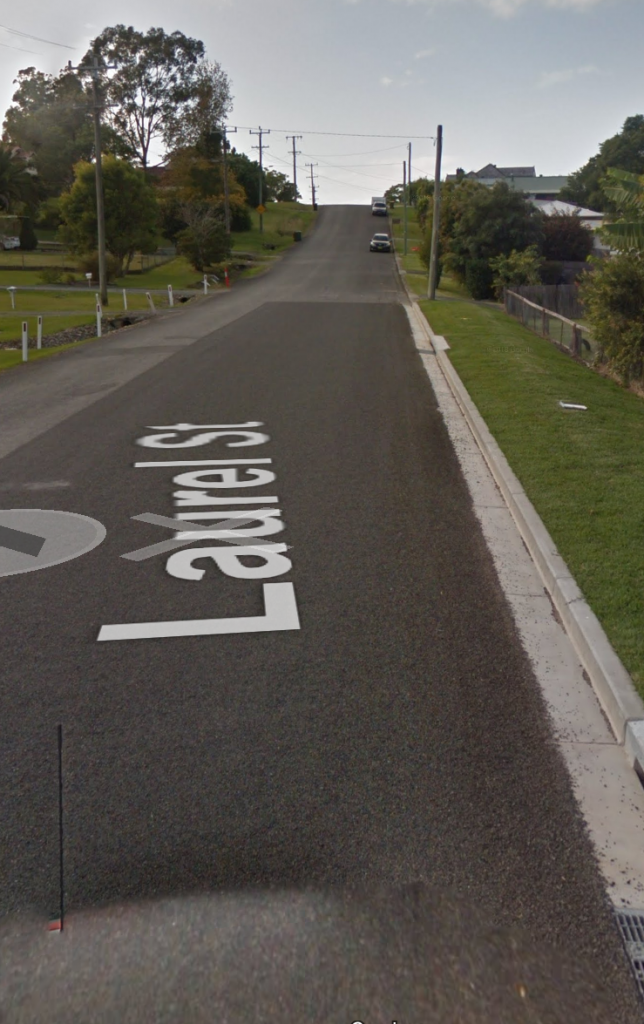 The cars would have to have been travelling quite slowly. He's heard a noise while inside, gone outside, and he's in time to see two cars, both drivers, and the child. The cars would have had to have turned in to Laurel St and proceeded uphill, with no vision of what was over the hill, then there's the intersection with Jackson St to the left, and then a T-intersection with Orara St at which they would have to stop and turn. All that would have slowed them down.