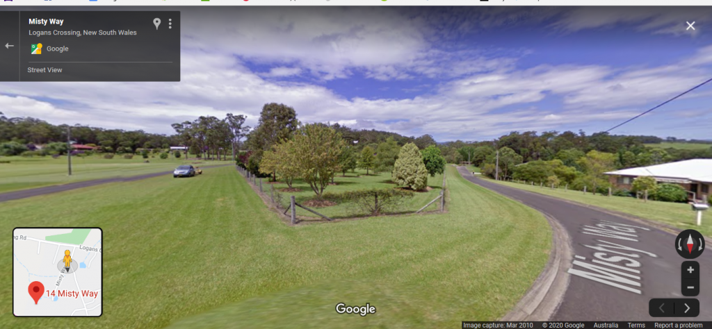 I understand FA's caravan when in Misty Way would have been in the bushy swampy area fronting the river at the end of the road. Street View stops at the end of the bitumen and it's 240-250m beyond that to the river. I came up with the 316 area of Herons Creek Road in the first place because I was looking for a good match to the search photos (and I looked a long way round); but those photos seemed purposely narrow shots and not all of the same place, so I'm not sure. (Thanks for GO's name, not the first time I've forgotten him or got him mixed up with someone else.)Geoff Owen lives at 14 Misty Way Logans Crossing. Frank Abbott after being kicked out of the caravan on Heron's Creek Rd, lived in another van next door to Geoff Owen. If you google 14 and 16 Misty Way you will see they are in a cul-de-sac with acreage properties and newer homes similar to Benaroon Dr. Very different to the houses along Herons Creek Rd and a lot less treed.
