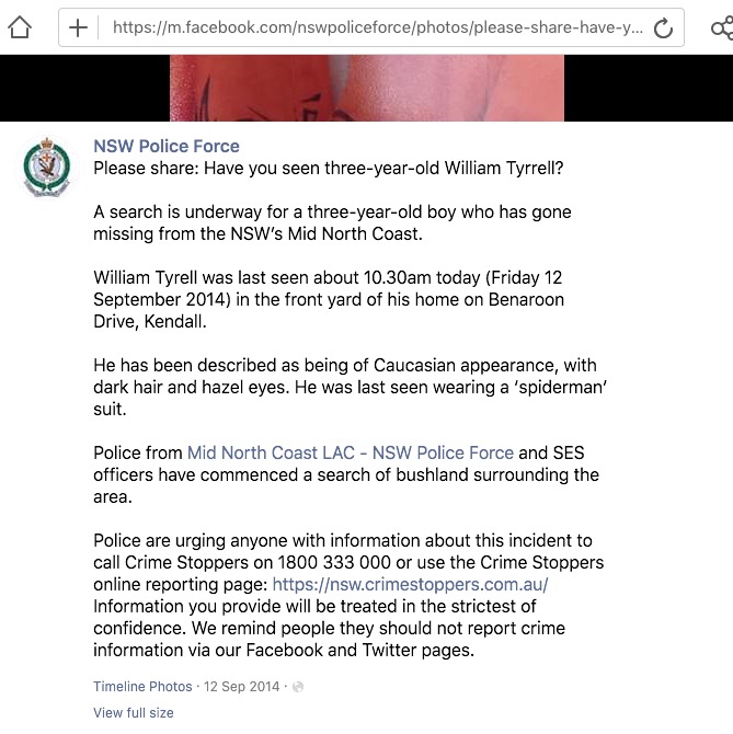 - screenshot of "Please share: Have you see three-year-old William Tyrrell?" NSW Police Force, Facebook public page photos, 12 Sep 2014 (I think a direct link won't work, but for me an internet search for "nsw police force facebook have you seen william tyrrell" produces a link at the top of results).