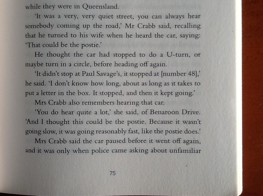 I wasn’t aware that the Crabb’s stated the car that sounded like the postie actually stopped in front of no. 48 and that it was 10.05am. That’s very interesting indeed.