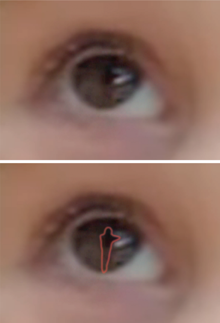 Zoomed in on Williams's eyes in the "roar" photograph and sharpened. There is clearly an adult standing up in the reflection of his eyes.