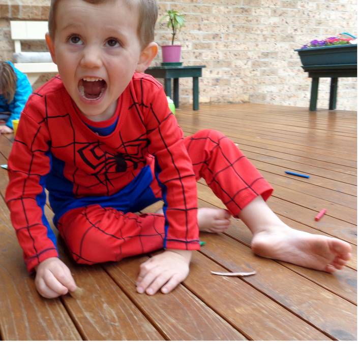 Yes, the pixelation is less in this picture and it looks like a leaf or similar. By the attitude of William, it does appear he is just about to come forward on all fours and roar (like a lion/tiger), while looking at someone to the left of the photographer. SouthAussie posted a screen capture in thread #1 of this patio area http://www.websleuths.com/forums/sh...-NSW-12th-Sept-2014-1&p=10976342#post10976342, and there is something looks like the top of William's suit that has been discarded on the floor, as I notice here there looks to be a t-shirt under the long sleeved top. The top looks to be predominantly blue with a red collar. I wonder if there was a little pair of shorts under the pants as well? In the screen shot, you can see the slippers being worn (by GM?) in this picture, the dolls pram and then what looks like the top of the suit in this picture. My guess is that whoever William was looking at was sitting in the chair on the left of that pic.