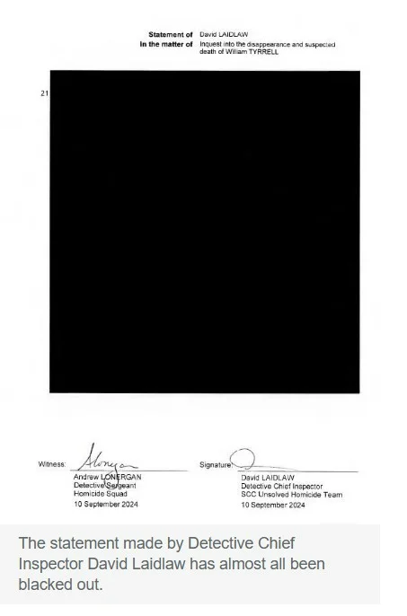 "The blacked-out sections include almost all of Detective Chief Inspector David Laidlaw’s statement ..... This was done because these sections contain “opinions” not “proper fact-finding”, according to the senior lawyer assisting the inquest." Link