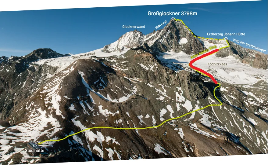 "The ridge classic of the Eastern Alps par excellence! The route, traversing glaciers, rocky terrain, and finally the sharp ridge with exposed climbing and wall sections, but never exceeding the 4th grade, makes the Stüdlgrat an impressive overall alpine highlight. Any ambitious and somewhat experienced mountaineer can experience an unforgettable day here. Due to the direct line to the summit, the tour is relatively 'quick' to complete, and the magnificent viewpoints along the ridge invite frequent stops to marvel at the scenery. The deep views to the south and the final summit panorama reward a journey that is often demanding. "