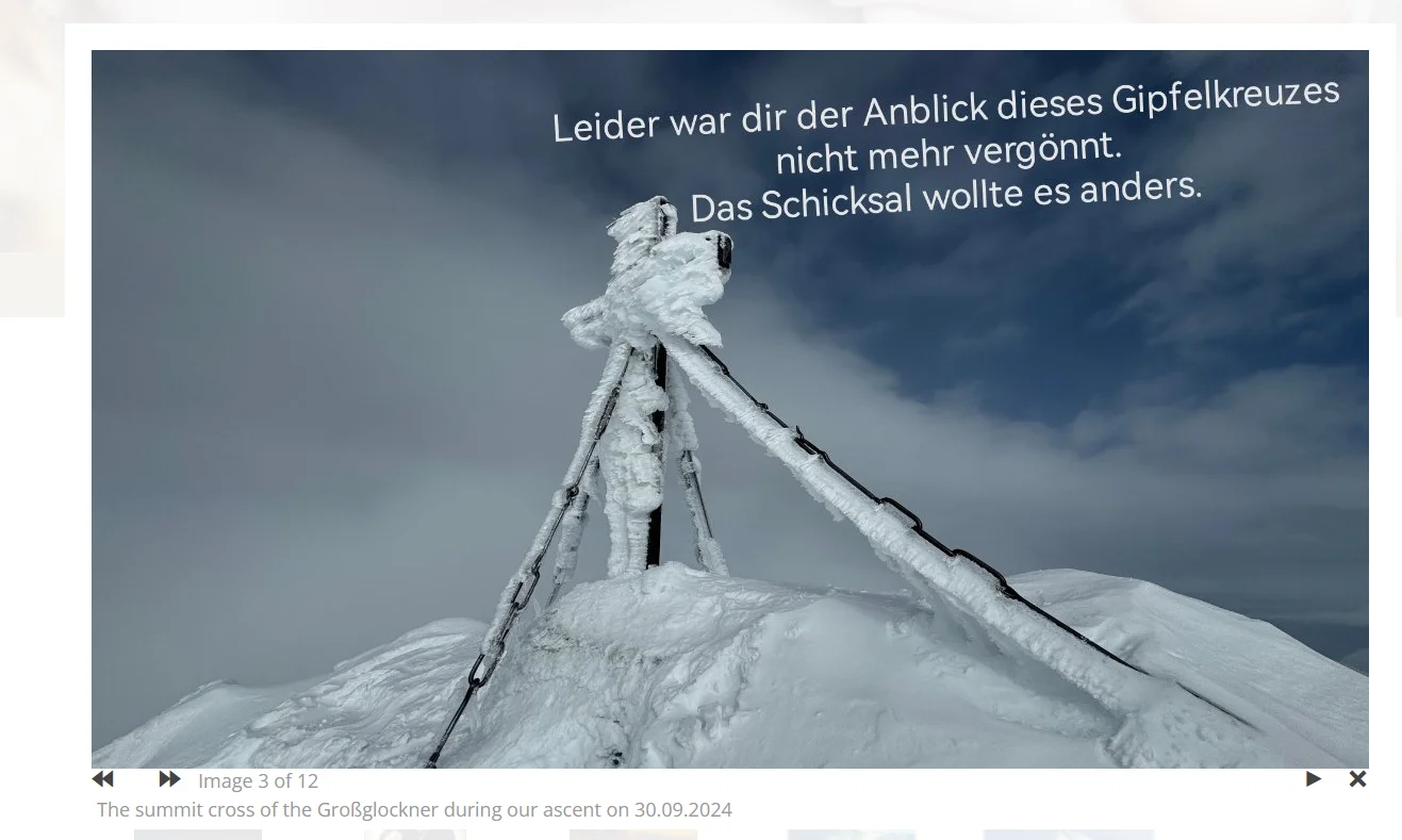 The German caption google translates correctly: "Unfortunately, you didn't get to see the summit cross. Fate had other plans."