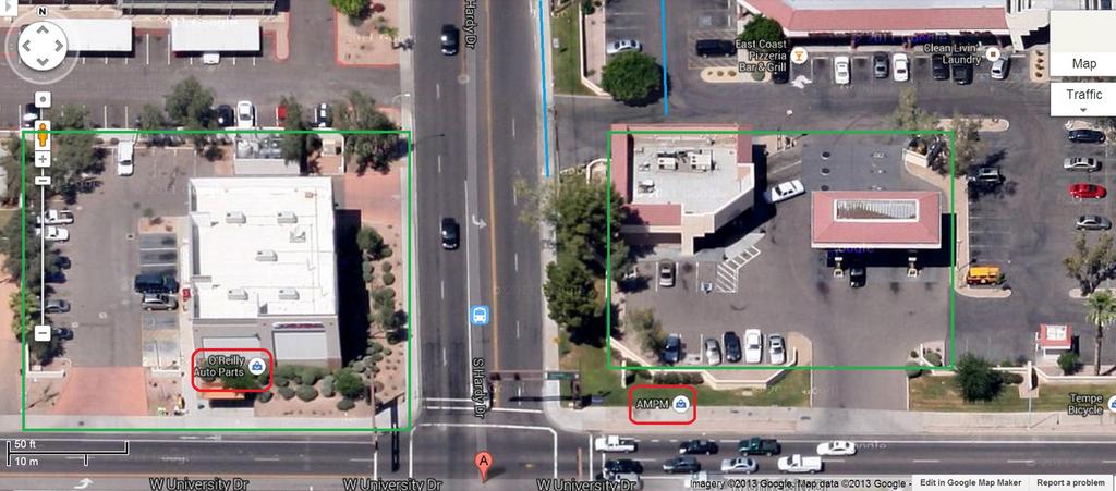 Green boxes are their respective businesses and parking areas. O'Reilly's has a high stucco wall around the non street property lines.