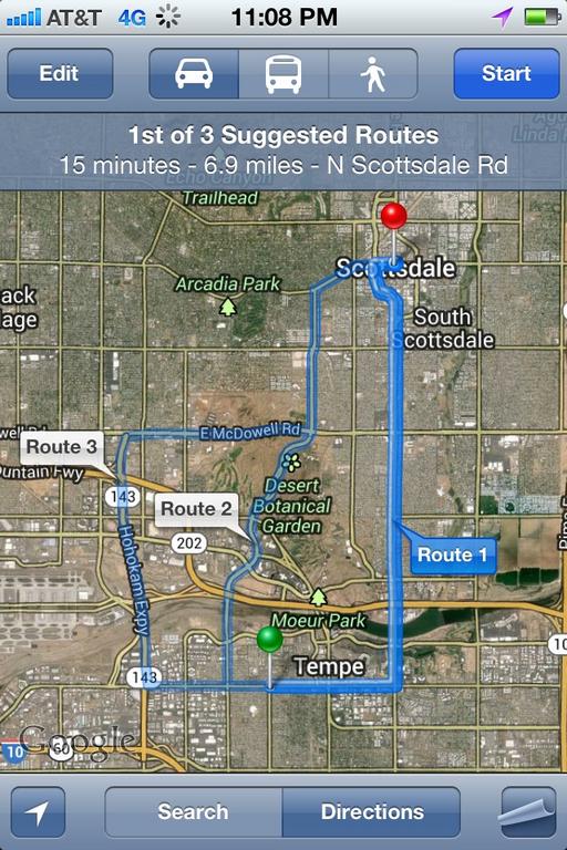 Indian School Rd and Scottsdale Rd (red) with possible routes. Since I don't have his exact apartment location, I'm just taking this as the closest thing we will get to pinpointing the Bf's complex according to the facts provided.